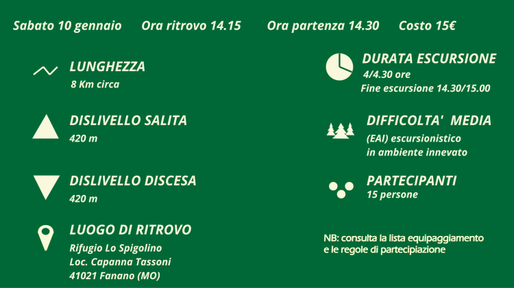 NB1: le ciaspole solo necessarie, anche in caso di poca neve o a tratti, per favorire la stabilità in caso di ghiaccio lungo il sentiero. Presso il Ristoro Lo Spigolino è possibile noleggiare le ciaspole a 10€ con bastoncini previa prenotazione.