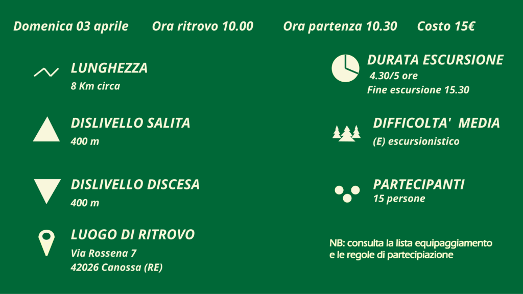L’itinerario si ripropone di percorre gli antichi sentieri, tra boschetti, praterie e calanchi, che percorrevamo in passato i sudditi dei due feudi matildici, ricalcando in parte anche due antichi percorsi della provincia reggiana: il Sentiero Matildico e dei Ducati.